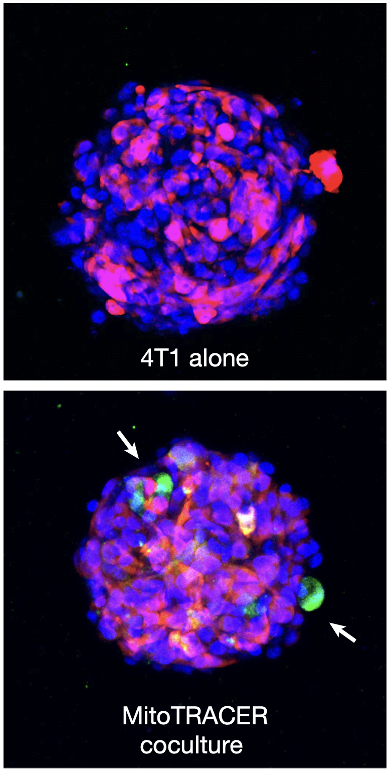 3D spheroids of SVZ-NSCsMitoTRACER mixed with 4T1 recipient cancer cells confirmed mitochondria transfer, evidenced by red-to-green fluorescence conversion in 4T1 cells (white arrows). Image credit: Grelet S, et al., Nature (2025), Figure 5a.