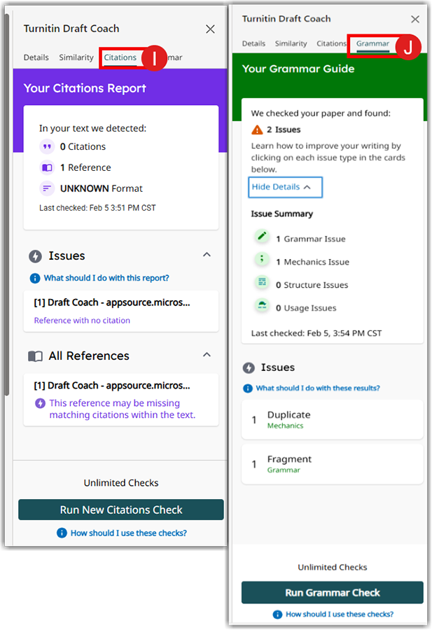 - Draft coach provides unlimited Citation check (I) and Grammar checks (J) for every document.