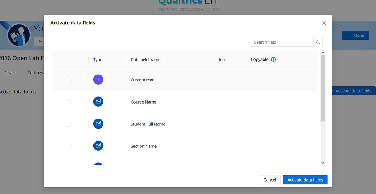 - You will see a pop-up window showing a list of data fields that can be activated. Below are the date fields available for you to use at UAB: