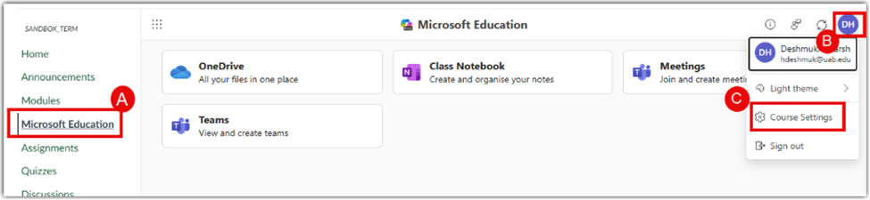 - Select Microsoft Education (A) then click your Profile Icon (B) and select Course Settings (C).