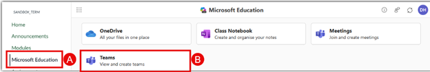 - Now that Microsoft Teams have been enabled into Microsoft Education and the changes are saved, select Meetings (B) from the Microsoft Education (A) dashboard.