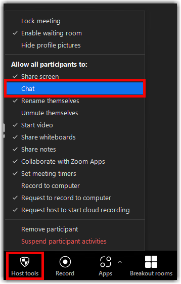 - Chat: Allows participants to use the chat function.