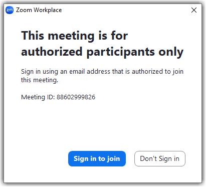 If a participant tries to join the meeting or webinar and is not logged into Zoom, or logging in with the specified email domain, they will receive one of the following messages: