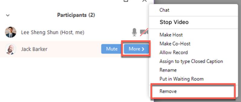 Note: Users removed from a meeting CANNOT rejoin that same meeting or future meetings with the same meeting ID. If you are wanting to remove someone that is not a threat, you can choose to move them into the waiting room instead.